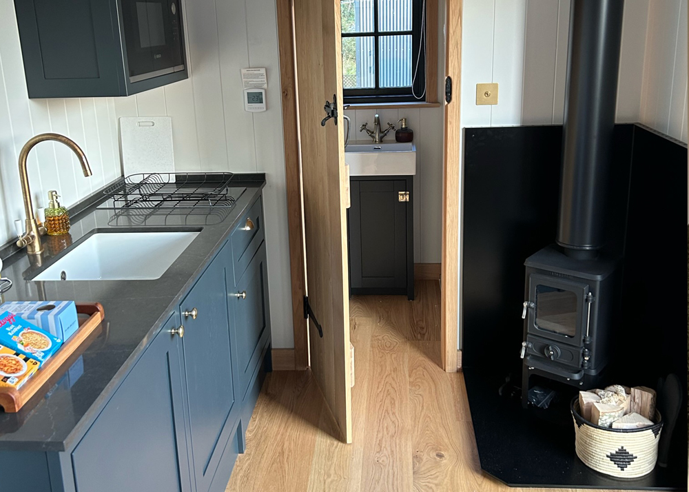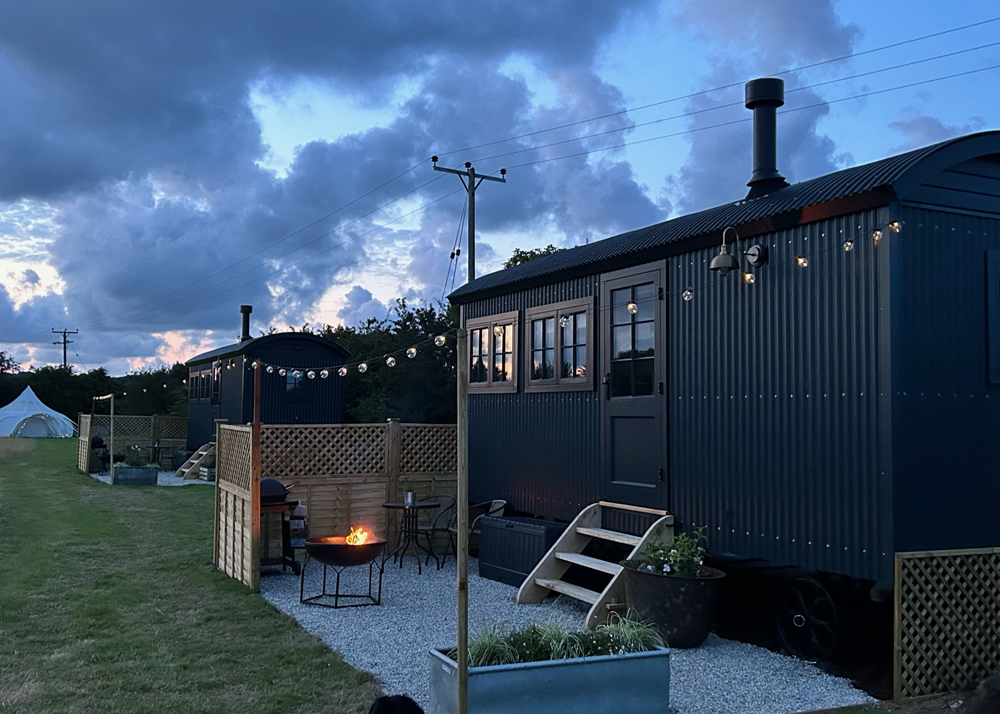 - With a wooden log cabin in front of you, turn right and 300 yards along you will come to the entrance of ‘The Hidden Field’. Please park in the car park and you will see the Huts at the bottom edge of the field.